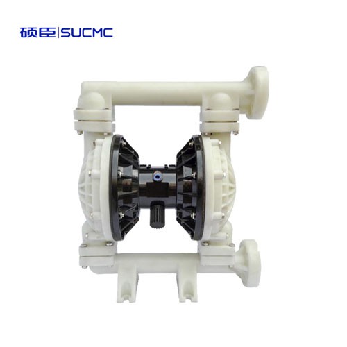 在隔膜泵的兩個對稱工作腔中,各裝有一塊有彈性的隔膜,聯桿將兩塊隔膜結成一體,壓縮空氣從泵的進氣接頭1進入配氣閥3后,推動兩個工作腔內的隔膜,驅使聯桿聯接的兩塊隔膜同步運動。與此同時,另一工作腔中的氣體則從隔膜的背后排出泵外。一旦到達行程終點。配氣機構則自動地將壓縮空氣引入另一個工作腔,推動隔膜朝相反方向運動,這樣就形成了兩個隔膜的同步往復運動。每個工作腔中設置有兩個單向球閥4,隔膜的往復運動,造成工作腔內容積的改變,迫使兩個單向球閥交替地開啟和關閉,從而將液體連續地吸入和排出。