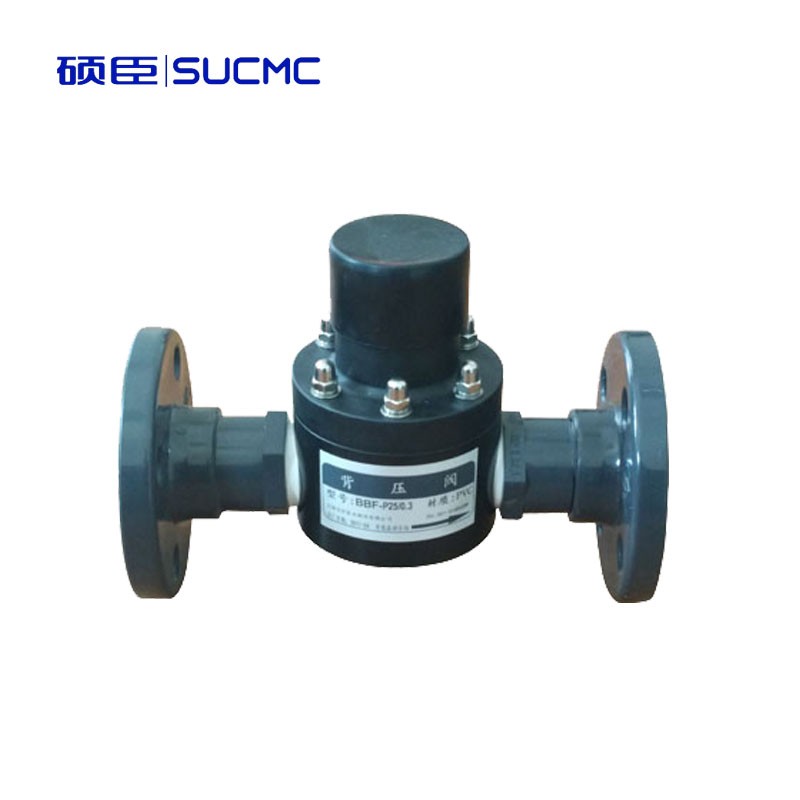 PVC背壓閥特點: 1,結(jié)構(gòu)緊湊、性能穩(wěn)定2,便于安裝調(diào)試3,反應靈敏、復現(xiàn)性好4,高性價比5,口徑選擇性大DN10mm-DN100mm6,壓力可在0-0.3MPa設(shè)定7,特殊設(shè)計的過流結(jié)構(gòu),壓差小不會形成截流8,帶調(diào)節(jié)機構(gòu),便于設(shè)定工作壓力9,可以安裝在旁路作為溢流閥使用10,可以作為防虹吸閥,防止靜態(tài)工況下的自流11,簡易可靠的標準安裝方式12,多種可選閥體材質(zhì)PVC、PP、304、316L、PVDF、碳鋼等13,多種隔膜材質(zhì)的選擇FPM、PTFE、EPDM、NBR等.